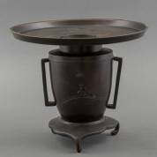 Japans bronzen ikebana vaas met zilver ingelegd decor, 19e/20e eeuw -één oor vermoedelijk opnieuw aangezet-, 25 × Ø 29,5 cm