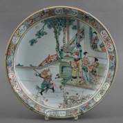 Chinees porseleinen schotel met famille verte decor van figuren bij een huis, gemerkt met schelp, Kangxi -gerestaureerd-, Ø 36 cm