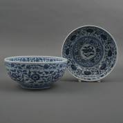 Chinees porseleinen kom met blauw-wit decor: bloemen, vogels en een band met paarden, circa 1640, herkomst: Hatcher Collection, Christie's Amsterdam 1984 -minieme randchipjes, glazuur aangetast-, 9,5 × Ø 20 cm