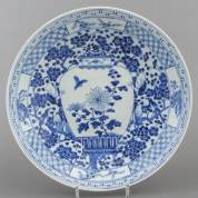 Chinees porseleinen schotel met blauw-wit decor: dekselvaas geflankeerd door twee mannen, eind 19e eeuw -bakfout in het plat, enkele randschilfertjes-, Ø 37 cm