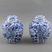 Paar Chinees porseleinen gemberpotten met blauw-wit drakendecor, voorzien van deksels, 19e eeuw -één deksel gelijmd-, 26 × Ø 22 cm