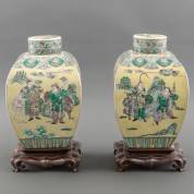 Paar Chinees porseleinen famille jaune dekselpotten met figurendecor, op hardhouten gestoken basement, circa 1900, Chenghua gemerkt -beide met gerestaureerde hals, één deksel gebroken maar gelijmd, chip, één basement met schade-, 31 × 20 × 20 cm