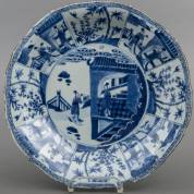 Chinees porseleinen schotel met blauw-wit landschapsdecor, Wanli, gemerkt met Johanneum-merk 'N: 99' -kleine randslijtages-, Ø 32 cm