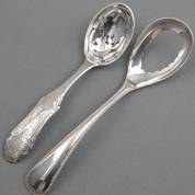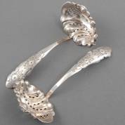 Paar 2e gehalte zilveren strooilepels met fijn gegraveerde steel en drie sterren in de ovale bak, meester: Andries Teunissen, Schoonhoven, 1876, gewicht 52 gram, 17 cm