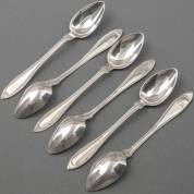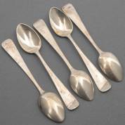 Vijf 2e gehalte zilveren theelepels, Hollands glad, meester: Albertus Adolf Johannes Gerritsen, Amsterdam, 1906-1908, gewicht 64 gram, 11 cm