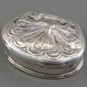Zilveren snuifdoosje, schelpvormig model met gedreven motieven op het deksel, Amsterdam, 1784, gewicht 26 gram, 5×3,5 cm -deukjes en restauratie-