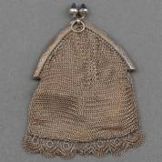 3e gehalte zilveren maliënbeursje, de sluiting gezet met cabochongeslepen blauw glas, brutogewicht 27 gram, 8,5 × 6 cm