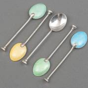 Vijf 1e gehalte zilveren theelepels met email achterzijde in diverse kleuren -één met beschadiging-, meester: Henry Clifford Davis, Birmingham, 1952, brutogewicht 46 gram, 9,2 cm