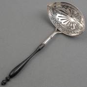 2e gehalte zilveren strooilepel met schuitvormige opengewerkte bak, afgezet met parelrand, en met ebbenhouten greep, meester: Hendrik van der Wolk, Utrecht, 1807-1809, brutogewicht 34 gram, 19 cm -barstje in houten steel-
