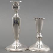 Twee verschillende 1e gehalte zilveren kandelaars -lichte gebruikssporen-, brutogewicht 536 gram, 18 en 12 cm hoog