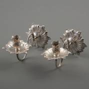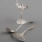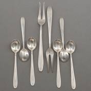 Zes 2e gehalte zilveren lepeltjes en twee vleesvorkjes, ontwerp Gustav Beran, meester: Gerritsen & Van Kempen, 1948, gewicht: 124 gram, lengte vleesvork 16 cm