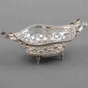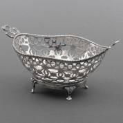 2e gehalte zilveren opengewerkt bonbonmandje met parelrand en krulgreepjes, staande op vier pootjes, onderzijde met pseudokeuren, 1900, gewicht 88 gram, 5,5 cm hoog