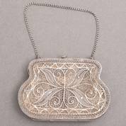 2e gehalte zilveren filigrain beursje aan ketting, Rusland, 19e eeuw, brutogewicht 66 gram, 8 × 5,5 cm