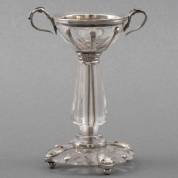 Bergkristallen bokaal op voet met 2e gehalte zilveren monturen, de voet met appliques in de vorm van zeewezens met rood glazen oogjes, draagt enkel een modern herkeur, hoogte 15,5 cm -defecten, veel steentjes missend-