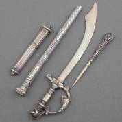 Divers klein zilver, diverse gehaltes: vulpotlood, brievenopener in de vorm van een zwaardje, priem, en naaldenkoker, gewicht 39 gram, zwaardje 14,5 cm