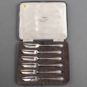 Zes 1e gehalte zilveren cocktailvorkjes, Birmingham, 1926, gewicht 79 gram, 13 cm