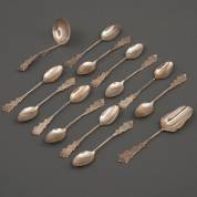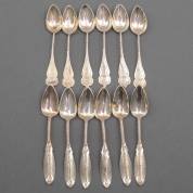 Twaalf 2e gehalte zilveren theelepels met getorste steel en kwast, en bijbehorend 2e gehalte zilveren roomlepel en suikerschep, gewicht 133 gram, theelepel 11 cm