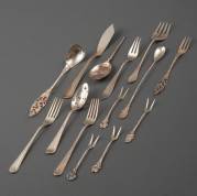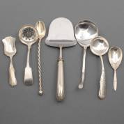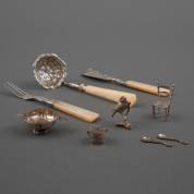 3e gehalte zilveren strooilepel met benen heft, 2e gehalte zilveren gembervork en botermes met parelmoeren heft, en zes 2e gehalte zilveren miniaturen, brutogewicht 182 gram