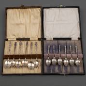 Zes 2e gehalte zilveren aposteltheelepels en zes theelepels bekroond door een bokkenpoot, beide sets in cassette, gewicht 222 gram, 8,5 en 10 cm