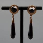 Paar 14kt gouden oorschroeven gezet met roosgeslepen granaat en een granaten pampel, brutogewicht 11,2 gram, lengte 5,2 cm