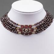 Vijfstrengs granatencollier, samengesteld met onedel element, gezet met granaat en rijstpareltjes -één parel mist-, brutogewicht 93 gram, lengte 36 cm, met aankoopbewijs uit 2012 van Antiker Schmuck uit Lauterbach voor een waarde van euro 2.300,-