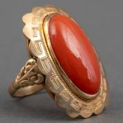 14kt gouden ring gezet met ovaal cabochongeslepen bloedkoraal, brutogewicht 5,6 gram, mt. 16,75