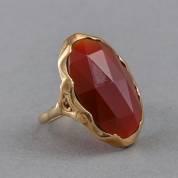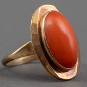14kt gouden ring gezet met cabochongeslepen bloedkoraal, brutogewicht 3,6 gram, mt. 16,75