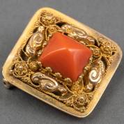 Ruitvormige 18kt gouden broche, vermaakt van een sluiting, gedecoreerd met filigrain, centraal gezet met een trapezoïdegeslepen bloedkoraal, brutogewicht 6,2 gram, 2,5 × 2,5 cm