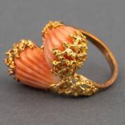 18kt gouden slagring gezet met twee geribde angelskin bloedkoraal in organisch gevormde zetting, brutogewicht 7 gram, mt. 16,75