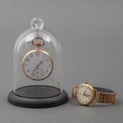 14kt gouden herenvestzakhorloge met mechanisch uurwerk, witgeëmailleerde wijzerplaat en geguillocheerd achterdeksel, brutogewicht 67,0 gram, Ø 4,7 cm, onder stolp, daarbij: onedel polshorloge Buren, aan rekband, Ø 3,2 cm