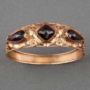 14kt gouden opengewerkte stijve armband gezet met drie roosgeslepen granaten, brutogewicht 21,8 gram, binnenmaat 5,1×6,2 cm