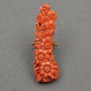14kt gouden ring gezet met gesneden bloedkoraal met bloemdecor -breuk-, brutogewicht 17,5 gram, afmeting bloedkoraal 5,3 × 1,5 cm, mt. 17,5