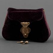 Paars fluwelen beursje met 14kt gouden sluiting, daarbij: twee gouden bolletjes, 8 × 5,3 × 1,5 cm