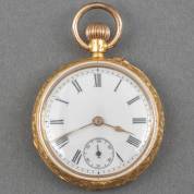 14kt gouden damesremontoir met mechanisch uurwerk, de witgeëmailleerde wijzerplaat met chronograaf, de kast gegraveerd met bloemmotieven, brutogewicht 24,7 gram, Ø 3,2 cm
