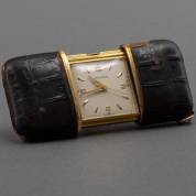 Verguld stalen reiswekkertje Movado, in alligatorlederen etui met hangoog, 5 × 3,4 cm -defecten aan leder-