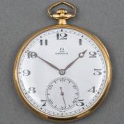 18kt gouden herenvestzakhorloge Omega, de geëmailleerde wijzerplaat met secondeaanduiding -binnenzijde achterplaat met inscriptie', brutogewicht 50 gram