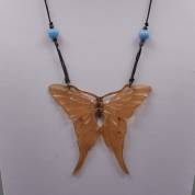 Hoornen vlinderhanger aan zwart zijden koord, gedecoreerd met twee blauwe glaskralen, art nouveau -kleine chipjes aan randen-, vlinder 7,5 × 8,5 cm, brutogewicht 10,20 gram