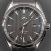 Stalen herenpolshorloge Omega Seamaster Aqua Terra, quartz, zwarte wijzerplaat met datum, aan originele stalen schakelband met klipsluiting, in originele doos met papieren en aankoopbon uit 2012, Ø 41 mm