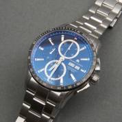 Stalen herenpolshorloge Maurice Lacroix, Pontos, PT6038 BA34961, automaat met blauwe wijzerplaat met chronografische aanduiding van seconden, dag en maand, daarbij dag van de weekaanduiding en tachymeter, aan stalen schakelband en wisselbare blauw textiel en lederen band met originele klipsluiting, Ø 43 mm, in originele doos met papieren