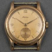14kt gouden herenpolshorloge Alpina, automaat, goudkleurige wijzerplaat met chronosecondeaanduiding, brutogewicht 27,4 gram, Ø 32 mm, met garantiebewijs 1951