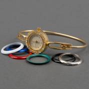 Verguld stalen damespolshorloge met quartz uurwerk, aan klemarmband, de bezel is te wisselen middels schroefmechaniek, met zes gekleurde ringen
