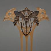 Hoornen haarspeld met gesneden plantenranken, waarom een zilveren applique van een nimf met libellenvleugels, Frankrijk, art nouveau, brutogewicht 15,40 gram, 13,5 × 10 cm
