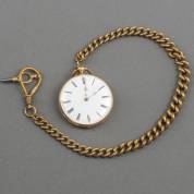 Herenvestzakhorloge in 18kt gouden kast, de email wijzerplaat met Romeinse cijfers, het sleutelopwind-uurwerk met cilindergang, adres: Vacheron & Constantin, 1870-1875, brutogewicht 54 gram, aan messing horlogeketting met sleutel