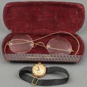 14kt gouden damespolshorloge aan zwart stoffen band, daarbij: BWGG brilletje, brutogewicht 26 gram