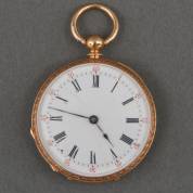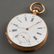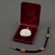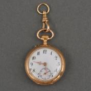 Herenvestzakhorloge in 14kt gouden kast, de email wijzerplaat met Romeinse cijfers en afzonderlijke seconde-aanduiding, begin 20e eeuw, brutogewicht 65 gram, in originele cassette, daarbij: haarwerk horlogeketting met drie gouden bedels