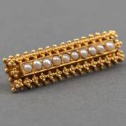 14kt gouden staafbroche gezet met zaadparels, brutogewicht 4,6 gram, 3,3 × 0,8 cm