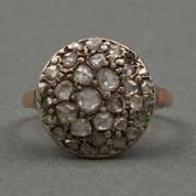 18kt gouden clusterring, de ronde zilveren zetting gezet met roosgeslepen diamanten, brutogewicht 3,88 gram, mt. 16