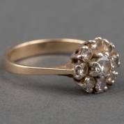 14kt gouden clusterring gezet met negen briljantgeslepen diamanten -scheen sleets-, brutogewicht 2,2 gram, mt. 16,75
