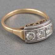 14kt gouden ring gezet met drie briljantgeslepen diamanten, brutogewicht 2,8 gram, mt. 16,5