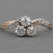 14kt gouden klaverring gezet met oudslijpsel diamanten, brutogewicht 1,9 gram, mt. 17